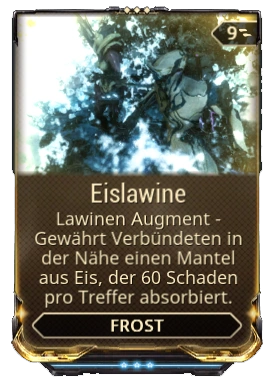 Eislawine ist ein Warframe Augment Mod für Frost, bei dem die Verbündeten einen Mantel aus Eis erhalten der Schaden pro Treffer absorbiert.