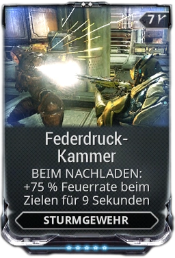 Federdruck-Kammer erhöht die Feuerrate für Gewehre beim Nachladen um +12,5% für 1,5 Sekunden pro Rang bis zu einem Maximum von +75% für 9 Sekunden auf Rang 5.
