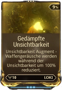 Gedämpfte Unsichtbarkeit ist ein Warframe Augment Mod für Loki, mit dem die Geräusche der Waffe, während Unsichtbarkeit aktiviert ist, unterdrückt werden.