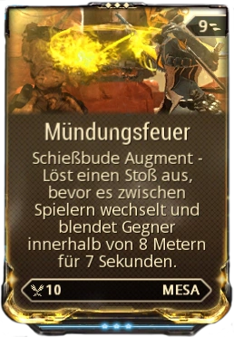 Mündungsfeuer ist ein Warframe Augment Mod für Mesa, welcher bewirkt, dass die Schießbude einen Blitz, der Gegner blendet, beim Wechsel auslöst.