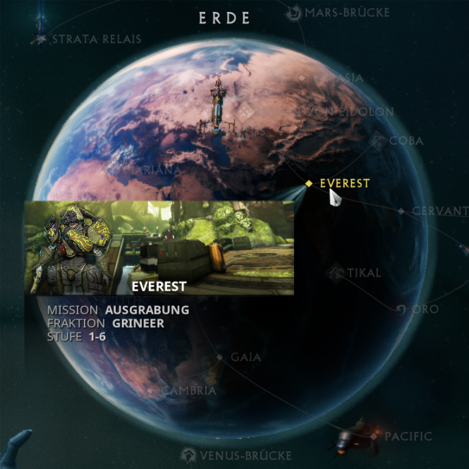 Der Missionsauswahlbildschirm für die Erde mit hervorgehobenem Missionsknoten.