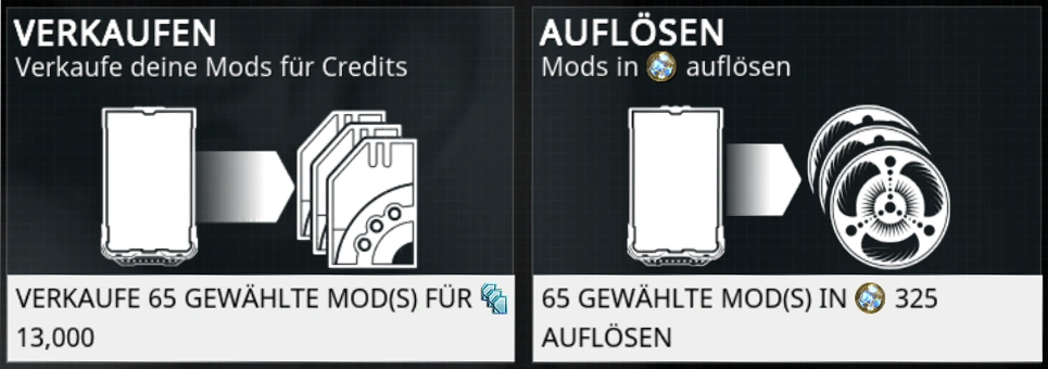 Um Mods gegen Credits zu verkaufen kann man das Mod oder ggf. einen oder gleich mehrere verschiedene Stapel anklicken, die jeweilige Anzahl auswählen und dann auf "Verkaufen" klicken. Klickt man mit der mittleren Maustaste (meist das Mausrad) auf einen Stapel, wird direkt der gesamte Stapel ausgewählt.