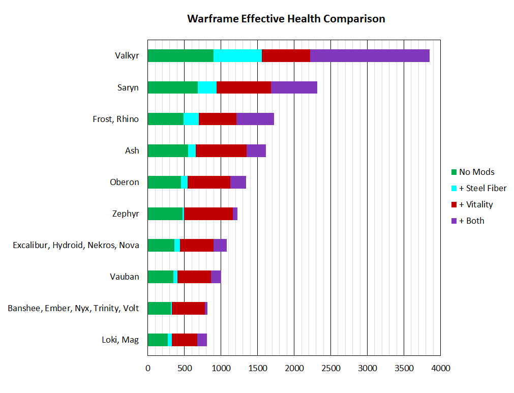 Der obige Graph vergleicht die effektive Gesundheit der Warframes untereinander. Die Berechnungen sind einmal ohne zusätzliche Mods (also nur auf Basis der maximalen Gesundheit und Rüstung), einmal mit einem maximierten Stahlfasern Mod (+110% Rüstung), einmal mit einem maximierten Vitalitäts Mod (+440% Gesundheit) und einmal alles zusammen.