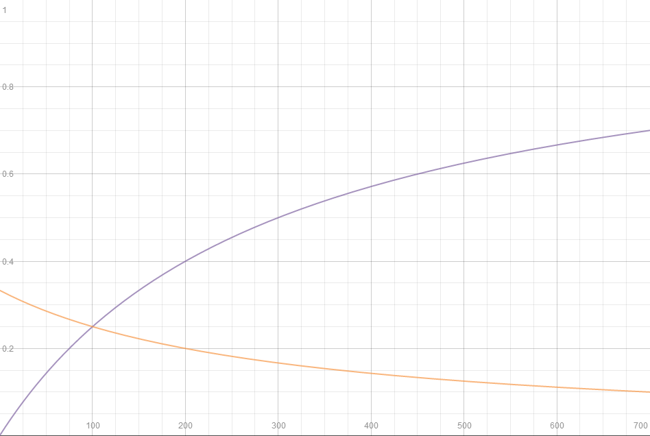 Dieser Graph visualisiert die Schadensabschwächung als eine Funktion von Rüstung in Lila und der Rüstungseffizienz in Orange.