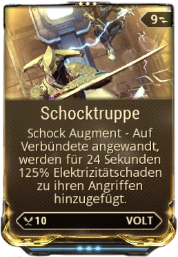 Schocktruppe ist ein Warframe Augment Mod für Volt, der es ermöglicht Schock auf Allierte zu wirken und temporär all ihren Angriffen