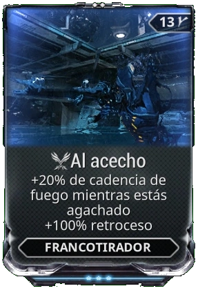 Al acecho es un mod de francotirador exclusivo de Cónclave que aumenta la cadencia de fuego mientras estás agachado a costa de un mayor retroceso.