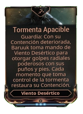 Tormenta apacible Con su Contención deteriorada, Baruuk toma mando de Viento Desértico con sus puños y pies. Cada momento que toma control de la tormenta restaura su Contención.