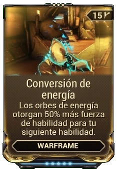 Conversión de energía es un mod de Warframe que aumenta la fuerza de habilidad para el siguiente lanzamiento de habilidad después de recoger un orbe de energía.