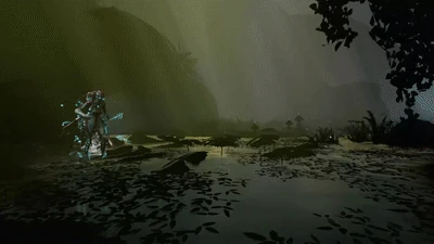 El Warframe deja a su paso un rastro de luciérnagas y hojas del bosque.