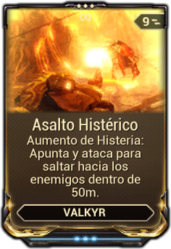 - La velocidad de ataque de Histeria se ralentiza significativamente si lo activas mientras llevas equipada un arma primaria o secundaria. Valkyr atacará normal si lo activas mientras tu arma –cuerpo a cuerpo— está equipada.