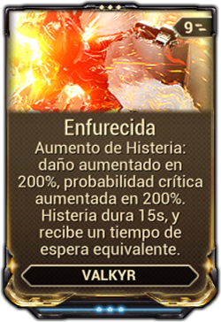 Valkyr que aumenta el daño y la probabilidad crítica pero fija la duración a 15 segundos y añade un enfriamiento equivalente. El coste de energía base aumenta a 50 mientras que el drenaje de energía por segundo es eliminado.