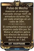 - Mecha Pulse (Warframe): Killing a Marked Enemy grants Armor for limited time for each enemy within an area