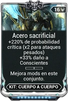 Está compuesto por 3 mods de Warframe y 3 mods para armas cuerpo a cuerpo.