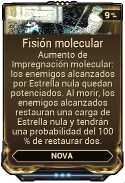 Fisión molecular es un mod de aumento de warframe para la habilidad impregnación molecular de Nova que hace que los enemigos afectados por dicha habilidad recarguen una carga de estrella nula al ser asesinados.