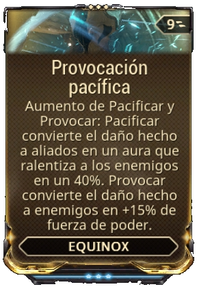 - La Equinox Noche emite un aura debilitante que afecta a todos los enemigos al alcance, reduciendo su daño hasta un 20% / 33% / 43% / 50% mientras más cerca estén de Equinox. Mientras Pacificar esté activo, 1.5 / 1.25 / 1 / 0.5 de energía se drenará por segundo por cada enemigo dentro del área del aura.