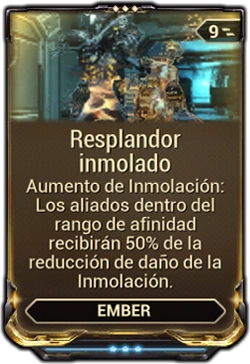 Resplandor inmolado es un mod de aumento de warframe para Ember que hace que su habilidad Inmolación también afecte a los jugadores aliados dentro del radio de afinidad. Los aliados reciben un 50% de la reducción de daño actual de la habilidad.