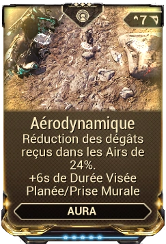 Aérodynamique est un mod d'Aura qui augmente la durée de la visée planée et de prise murale, tout en réduisant les dégâts reçus dans les airs.