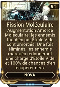 - Amorce Moléculaire ne s'additionne pas si de plusieurs Nova l'utilisent. Les ennemis recouverts ne peuvent pas être l'être encore tant que leur bonus ou affaiblissement actuel ne s'est pas estompé.