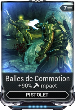 Balles de Commotion augmente de 10% les dégâts d' Impact par rang pour les pistolet, jusqu'à un maximum de 60%.