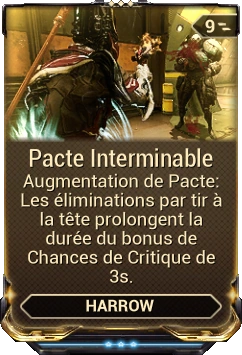 Pacte Protégez les alliés à portée d'affinité grâce à une entité énergétique qui absorbe tous les dégâts puis les convertit en un bonus de chance de coups critiques pour tous bénéficiaires du Pacte. Les tirs à la tête sont encore plus avantagés. |