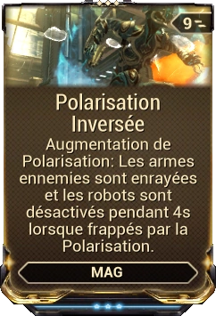 Polarisation Émet une pulsation énergétique qui disloque les boucliers ou l'armure ennemie, créant des éclats extrêmement dangereux, particulièrement sur les cibles magnétisées. Les boucliers alliés touchés par l'impulsion seront restaurés.