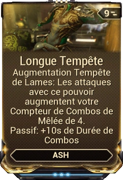 Tempête de Lames Envoie des clones d'ombres d'Ash dévaster les groupes d'ennemis distants. Rejoignez la mêlée en utilisant Téléportation. Drain d'Énergie :Energie par Marque: 12 Energie par Marque (invisible): 6