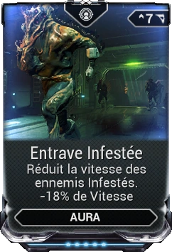 Entrave Infestée est une Aura qui réduit la vitesse des Infestés de 3% au rang 0, pour un maximum de 18%.