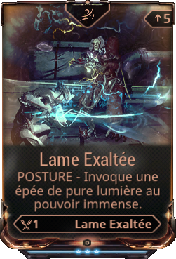 Lame Exaltée est une Arme Exaltée. Elle est considérée comme une arme supplémentaire, dont les caractéristiques sont influencées par les Mods de Puissance installés sur Excalibur. Lorsqu'Excalibur en est équipé, il est possible d'améliorer l'arme depuis l'inventaire, comme les armes classiques, notamment les Mods. - Cette compétence consomme de l'énergie sur le temps jusqu’à épuisement total de l'énergie.