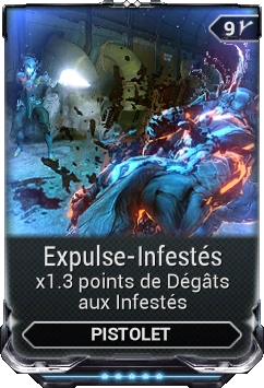 Expulse-Infestés augmente les dégâts des armes secondaire contre les Infestés de 5% par rang pour un maximum de 30% au rang 5. Il est cumulable avec Nuée de dards.