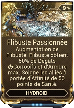 | Fichier:Flibuste.png | Flibuste Pillez l'armure des ennemis proches et augmenter les Dégâts Corrosifs de vos Pouvoirs et de vos armes. Les ennemis affectés par un Effet de Statut Corrosif offrent une augmentation plus importante. |
