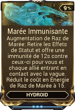 - Hydroid se transforme en liquide et s'élance, augmentant sa vitesse à 20/25/27,5/30 mètres par seconde sur une durée de 1 seconde. Les ennemis dans un rayon de 3/4/5/6 mètres de la vague, prennent 100/200/250/300 de dommages d' Impact lorsque la vague se déplace et 100/200/250/300 dommages Tranchant quand la vague se brise à la fin de la durée.
