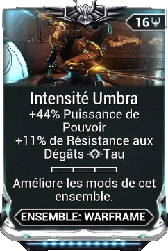 Intensité, augmentant la puissance des capacités de la Warframe et la résistance aux dégâts contre les Sentients.