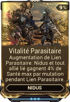 - Nidus consomme 1 Charge de Mutation pour effectuer une symbiose avec une Warframe alliée dans les 24/28/34/40 mètres ou créer un lien parasite avec un ennemi ciblé dans les 10/13/16/20 mètres. Le lien persiste aussi longtemps que Nidus et sa cible restent à portée l'un de l'autre, pendant une durée de 30/35/45/60 secondes. Le lien se brise lorsqu'il est désactivé manuellement en appuyant à nouveau sur la touche de la capacité (par défaut 3, lorsque Nidus et sa cible s'éloignent trop et lorsque la durée du lien expire.
