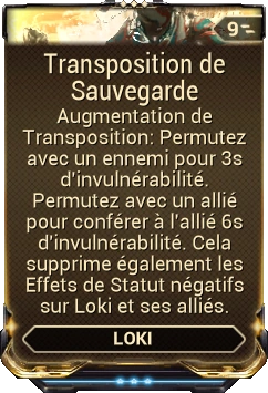 Trinity sont les seules Warframes à ne pas posséder de pouvoirs offensifs. A noter que sans être purement offensive, la capacité d'Invisibilité octroie d'importants bonus de dégâts au corps à corps lors de son utilisation, ce qui permet, avec l'équipement adéquat, d'abattre furtivement plusieurs ennemis. - Son nom vient du dieu nordique Loki, généralement connu comme un être malicieux et farceur. La Warframe Loki possède la capacité de créer un leurre de lui-même, de se rendre invisible, de désarmer les ennemis possédant une arme à distance, les obligeant alors à prendre une arme de mêlée pour vous attaquer et enfin, d'utiliser la transposition ( changement de position d'un point A vers un point B) avec un allié ou un ennemi.