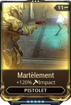 Martèlement est un mod pour les armes secondaires qui augmente les dégâts d' Impact, de 20% au rang 0 et jusqu'à un maximum de 120% au rang 5.