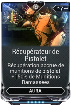 Le mod Récupérateur de Pistolet est une Aura qui augmente le taux de récupération des munitions des armes secondaires, sur les ennemis et dans les conteneurs.