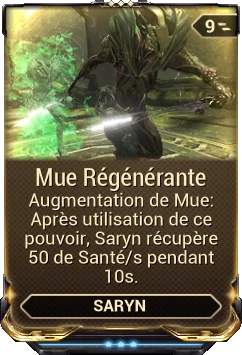 - Saryn jette sa peau, purgeant tous effet de Statut et en laissant derrière un leurre qui attire le feu ennemi. Avec 400 de bouclier et 150/300/400/500 de santé , le leurre reste en place pour un maximum de 7/12/16/20 secondes. Le leurre explose, infligeant 120/150/175/200 de dégâts de Poison s'il perd tous ses points de vie ou si la durée expire. Tout les ennemis présents dans un rayon de 5/6/7/10 mètres subissent un DoT de poison quand l'explosion est prématurée.
