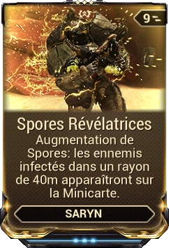 - Saryn marque une cible à moins de 30/40/50/60 mètres avec 2/2/3/3 spores. Chaque spore inflige des dégâts Corrosif par seconde avec une chance de Statut de 50% jusqu'à ce qu'elle soit détruite ou son hôte tué.