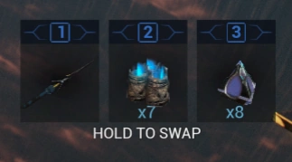 Az ikonok felett jelzett billentyűk hosszú lenyomásával váltogathatunk a szigonyok, csalétkek és esszenciák között, balról jobbra ebben a sorrendben.