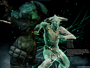 Loki è un Warframe fragile ma anche un grande manipolatore. Non ha abilità che fanno danno direttamente, ma le sue abilità di concentrano nell'arte della distrazione, del sabotaggio e della infiltrazione.