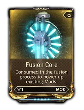 When fusing mods to upgrade them, Fusion Cores can be substituted for regular mods to increase the upgrade energy of a mod. The amount of energy given to a mod when a Fusion Core is used depends on its rarity and level. The higher level the Fusion Core, the more upgrade energy will be applied to the mod during fusion. Fusing rarer mods and cores is much more cost efficient than fusing common versions.