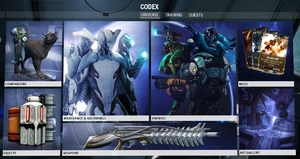 O Codex é um banco de dados no jogo que contém dados sobre todos os aspectos do Warframe. Várias seções do Codex são automaticamente preenchidas conforme o conteúdo é liberado (Warframes, Armas, Eventos, Sentinelas, Armas de Sentinelas) e são adicionalmente usadas para rastrear o progresso do jogador na obtenção e nível desses itens.