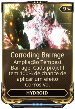 Corroding Barrage é um mod de ampliação para Hydroid onde cada projétil de Tempest Barrage tem uma chance por cento de infligir um efeito de status