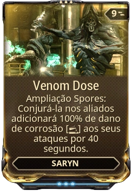 Venom Dose é um mod de ampliação para Saryn que permite Spores para ser lançado em aliados, concedendo-lhes temporariamente dano