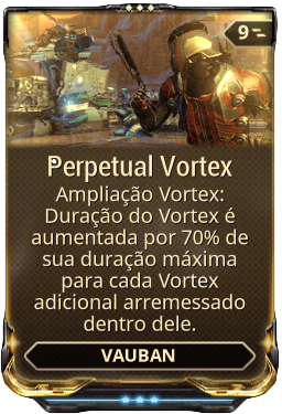 Perpetual Vortex é um mod de ampliação para o Vortex do Vauban que aumenta sua duração para cada Vortex adicional jogado nele.