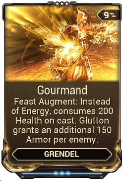 Grendel gains 50 additional armor for every enemy swallowed via Feast, but each enemy in his stomach drains 1.5 points of energy per second (or 30 health per second with the Gourmand augment), which ramps up the longer they remain trapped. Once all his energy is drained (in Gourmand's case, Grendel's health reaches 1), or Feast's ability key is held, Grendel vomits out all stored enemies and loses his armor bonus.
