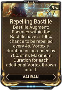 Repelling Bastille is a Warframe Augment Mod for Vauban's Bastille that repels new enemies when it reaches the maximum amount of enemies it can contain, and increases Vortex's duration for every additional Vortex thrown into it.