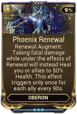 Phoenix Renewal is a Warframe Augment Mod for Oberon's Renewal. If a player takes fatal damage while under the effects of Renewal, instead of becoming incapacitated, the player is healed for a percentage of their health and granted 5 seconds of invulnerability. Each player that triggers Phoenix Renewal's effects must individually undergo a 90-second cooldown before they can benefit again.