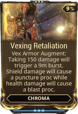 Vexing Retaliation is a PvEWarframe Augment for Chroma that makes Vex Armor detonate an area-of-effect attack upon receiving 150 incoming damage, dealing procs on enemies.