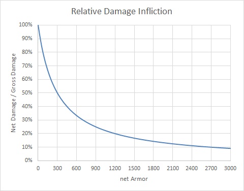 A net armor value of 300 will reduce incoming damage by 300 ÷ 600 = 50%, so only half of the weapon's damage is inflicted in total. At 600, you receive only 33% (reduction is 600 ÷ 900 = 66.6667%) of a weapon's outgoing damage. At 900 armor, inflicted damage is only 25% (reduction 900 ÷ 1200 = 75%), and so on.